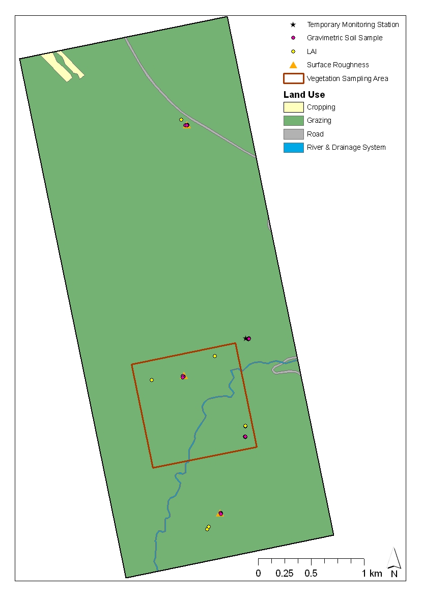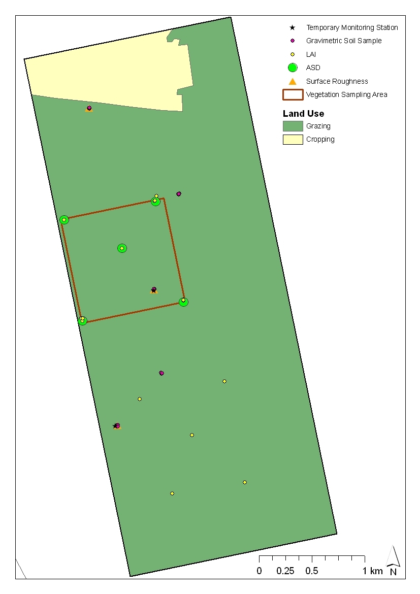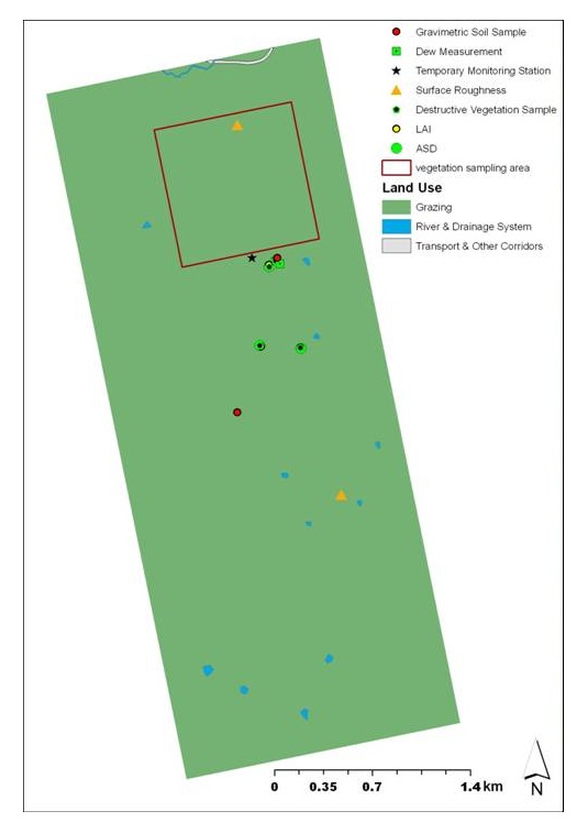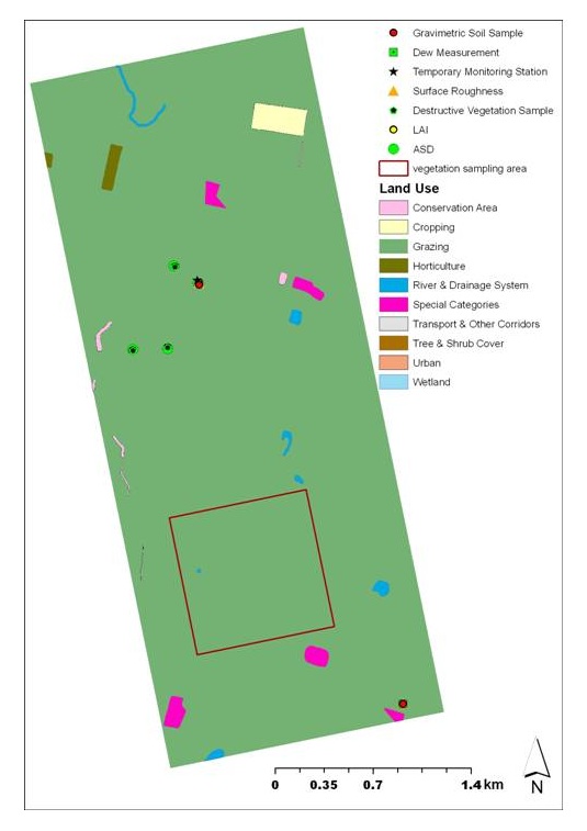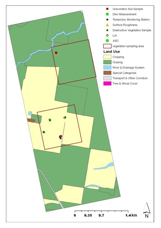 Vegetation samples for biomass, vegetation water content and surface reflectance/LAI measurements have been collected in 1km boxes which represent 1km resolution PLMR pixels. Within each box, the major vegetation types have been characterised by making measurements at a minimum of 3 sampling locations distributed within homogeneous crops/paddocks. The figure shown above illustrates the rationale of the vegetation sampling locations according to the 1km box classification and the major vegetation types. Vegetation samples were repeated for each vegetation type or maturity across the focus farm transect.