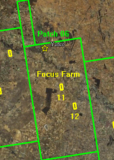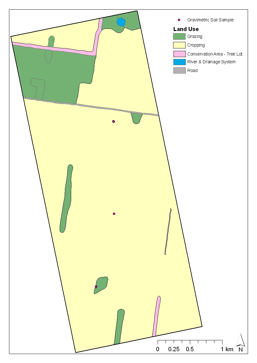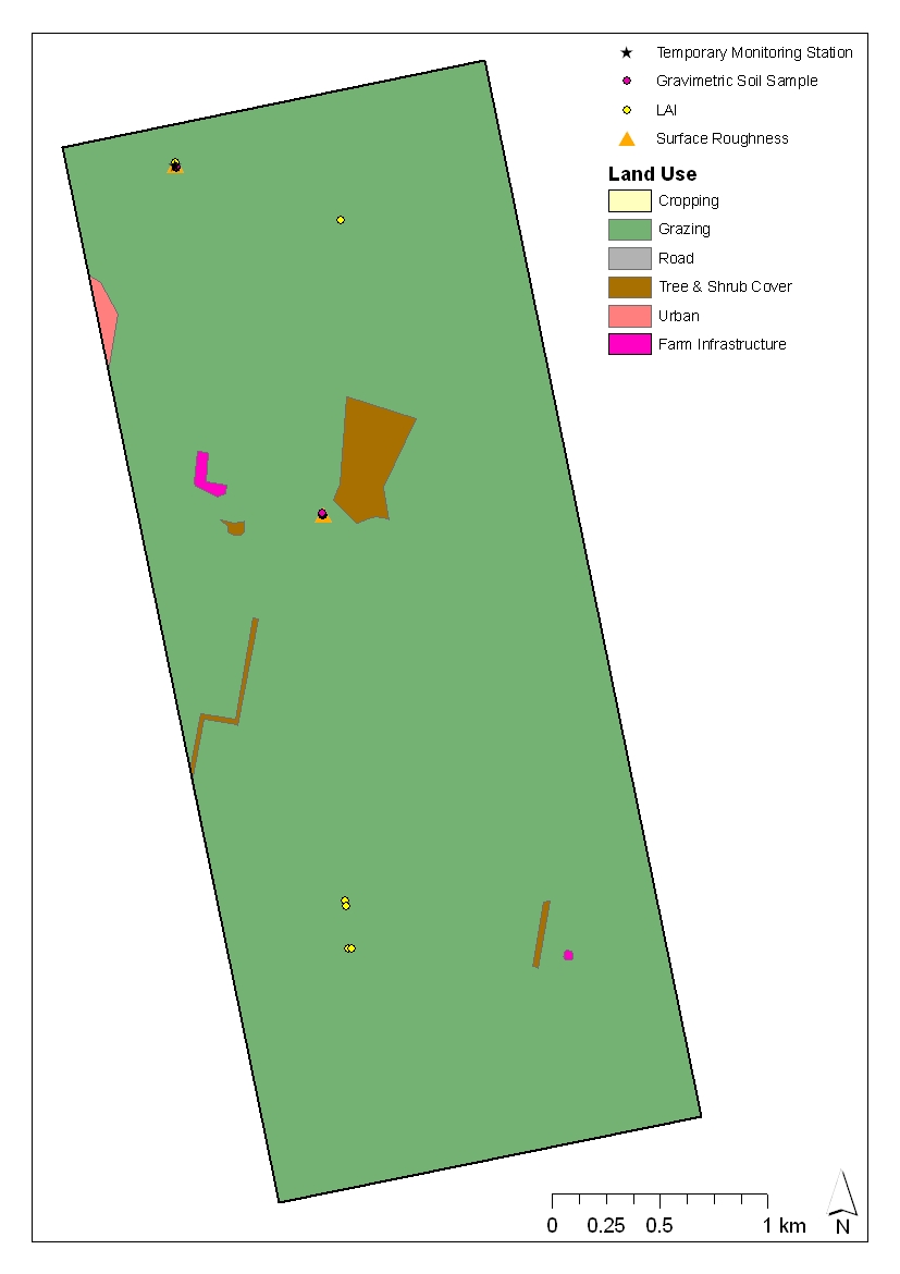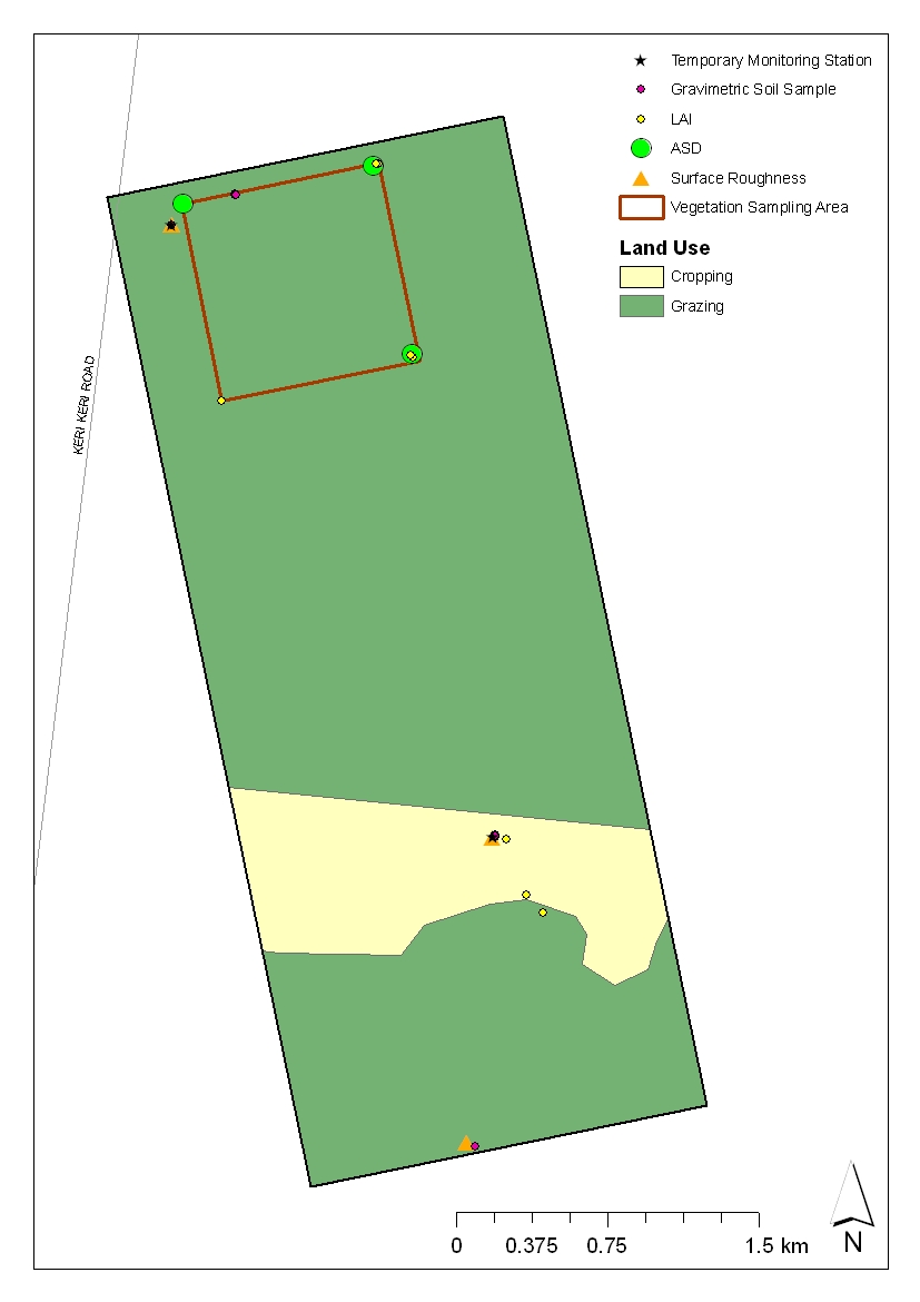 Vegetation samples for biomass, vegetation water content and surface reflectance/LAI measurements have been collected in 1km boxes which represent 1km resolution PLMR pixels. Within each box, the major vegetation types have been characterised by making measurements at a minimum of 3 sampling locations distributed within homogeneous crops/paddocks. The figure shown above illustrates the rationale of the vegetation sampling locations according to the 1km box classification and the major vegetation types. Vegetation samples were repeated for each vegetation type or maturity across the focus farm transect.