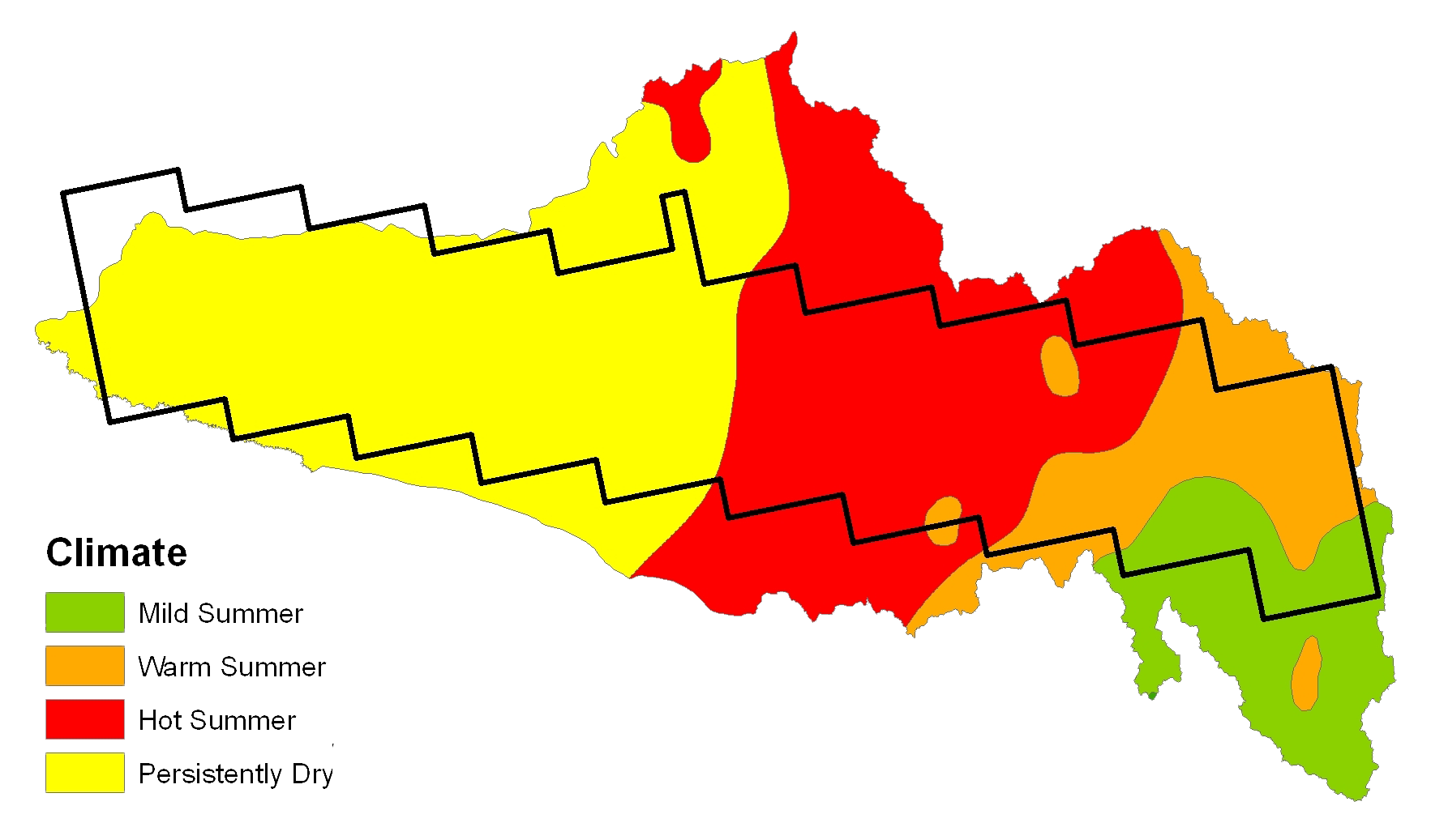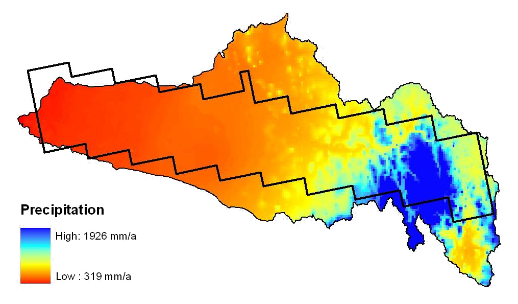 ClimateTemporal climatic variations are primarily associated with elevation, varying from semi-arid in the west to temperate in the east, and resulting in a general distribution into four categories. The total averaged annual rainfall for the entire Murrumbidgee river catchment is about 530mm, with a mean annual precipitation of 300mm in the west and about 1,900mm towards the east in the Snowy Mountains. The actual evapotranspiration is equivalent to precipitation in the west but represents only half of the precipitation in the east. Long term averaged precipitation data for the Murrumbidgee Catchment shows a relatively constant rate of rainfall across the year, with a slight increase in winter and decrease in summer. In contrast, the total evaporation rate fluctuates significantly depending on the seasonal conditions, with the monthly potential evapotranspiration dropping from 200mm during the summer to 25mm during the winter. Consequently, during May to August there is potentially recharge since the evapotranspiration rate is less than the amount of precipitation. During the winter period, precipitation above 1,200m typically falls as snow, with regions above 1,400m usually covered by snow for a few weeks of the year. Moreover, above 1,800m the snow cover can last for four months or more (Whetton et al., 1996). Climate, precipitation, areal PET, and snow coverage data have been sourced by the Bureau of Meteorology, Australia.