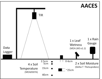 Due to limited equipment, the temporary stations were moved across the study transect, with monitoring stations set up during the teams site reconnaissance, which was scheduled at least the day before the actual airborne observation of the focus farm. These short-term monitoring stations have been instrumented with a raingauge, thermal infrared sensor, leaf wetness sensor (MEA LWS v1.1), two soil moisture sensors (Delta-T Thetaprobes; 0-5cm and 20-25cm) and four soil temperature sensors (MEA6507A; 2.5cm, 5cm, 15cm and 40cm depth) in order to provide time series data during the sampling period.
