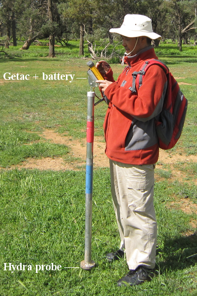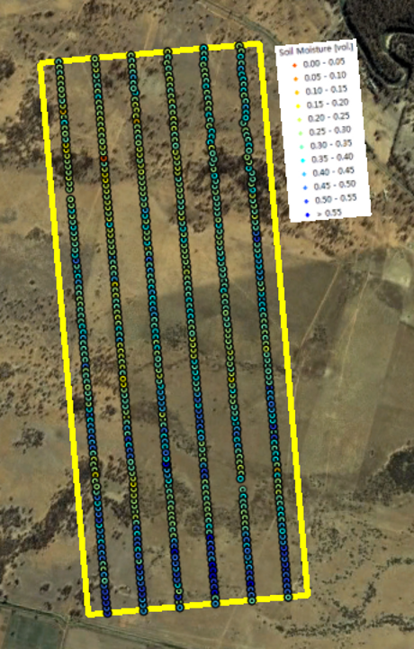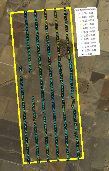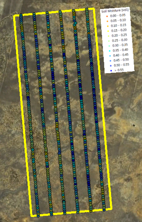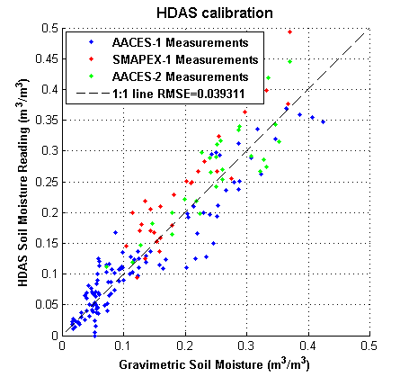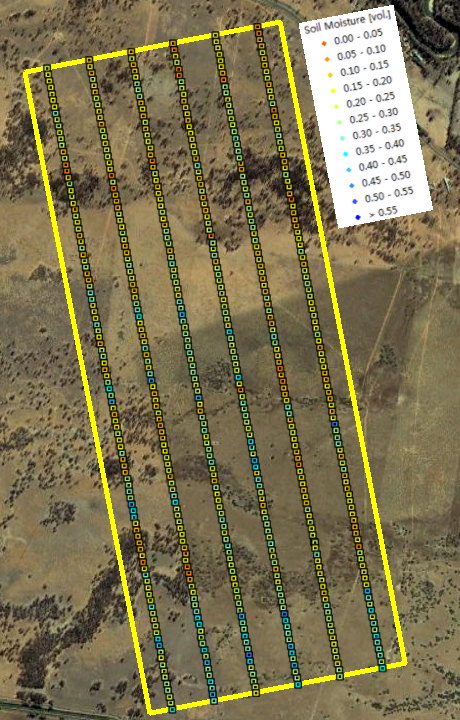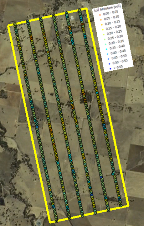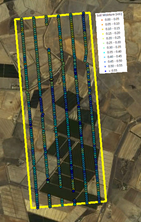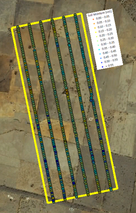 Within each of the flight patches focus areas of 2km × 5km size (oriented along the direction of flight lines) had been established and subdivided by six ground sampling transect lines, each 5km in length and 330m apart. The ground teams made three surface soil moisture measurements (within a radius of 1m) every 50m along these transects using the Hydraprobe Data Acquisition System (HDAS). This allows the effect of random errors in local scale soil moisture measurements to be minimised. To facilitate comparisons between SMOS, airborne observations, and the detailed ground measurements, ground soil moisture sampling took place from 5-9am. The soil moisture calibration equation for the HDAS system has been confirmed during the AACES-1, SMAPEX-1, and AACES-2 campaigns.