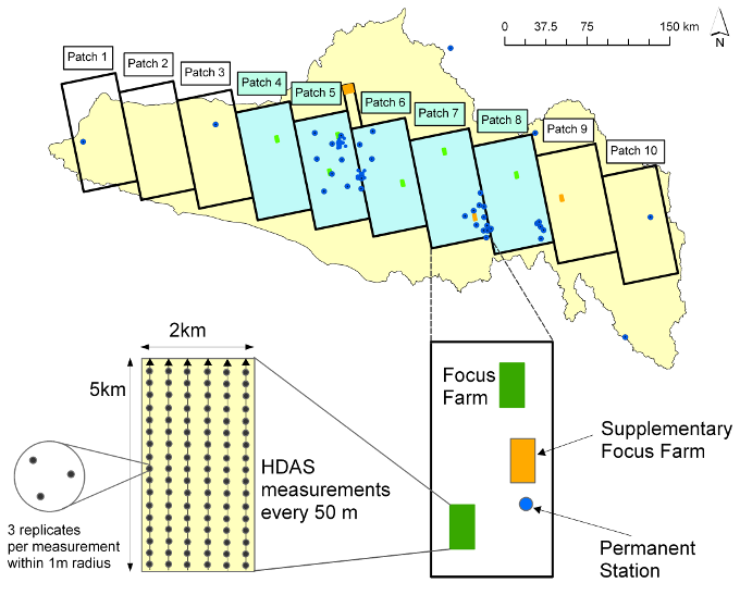Soil Moisture Sampling For logistical reasons, the AACES study area had been divided into 10 patches. AACES-2 focused on the central half of the transect (P04-P08) with each patch being the focus of a single day of ground monitoring and coincident aircraft/SMOS coverage. A total of 6 focus farms had been selected across the AACES-2 study area to provide ground truth for several 1km resolution PLMR pixels along the flight track.