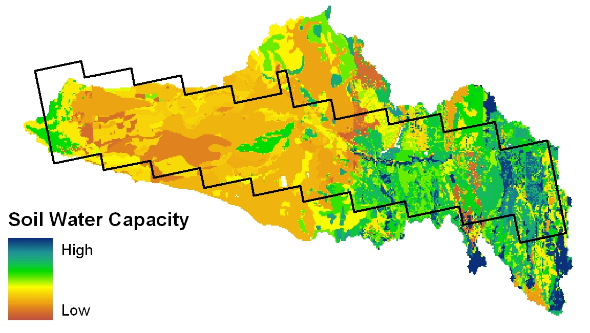 Soil water capacityA figure of the predicted soil water holding capacity of the A-horizon (top soil) derived from soil mapping within the Murrumbidgee River basin is shown below. It is a measure to determine the amount of water which is stored in the soil and available for plants to use. The given capacities are based on the difference in volumetric water content between permanent wilting point and field capacity, converted into a depth, by using the depth of the A-horizon as a reference. Soil water capacity data have been sourced by the Bureau of Rural Sciences, Australia.