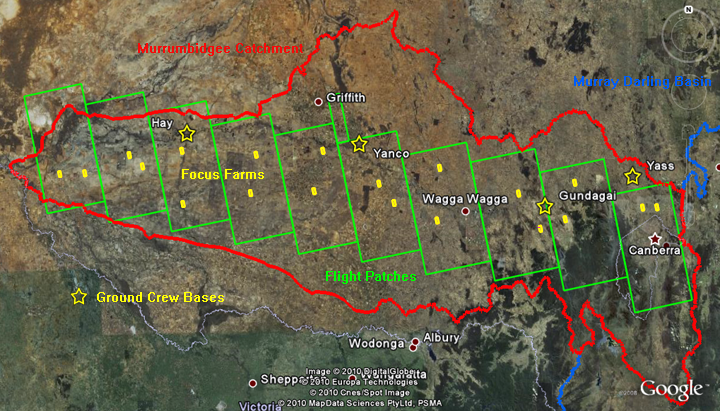 Experiment OverviewWith the European Space Agency's (ESA) Soil Moisture and Ocean Salinity (SMOS) satellite successfully launched on 2nd, Nov. 2009, the first long-term space-borne passive microwave observations at L-band (~1.4 GHz) have become available. Consequently, SMOS is the first mission dedicated to global mapping of near-real-time surface soil moisture information. Though space-borne microwave instruments have measured global data at high frequencies (e.g. C- and X-band) for the last 20 years, this innovative L-band radiometer uses a new synthetic aperture concept that provides observations at multiple incidence angles. Consequently, the observed brightness temperature data and derived soil moisture product must both be validated. To achieve this, intensive field campaigns are being planned world-wide to support the satellite mission with reliable data from i) passive microwave airborne observations at L-band, ii) detailed ground measurements of surface soil moisture content and associated environmental parameters, and iii) long-term soil moisture monitoring network data from anchor sites (e.g. Murrumbidgee in Australia, Valencia in Spain, Upper Danube in Germany, Midi-Pyrenees in France etc.). With the SMOS launch being in the northern hemisphere autumn, Australia is particularly well positioned for conducting the first intensive SMOS validation campaign during its growing season. Murrumbidgee Catchment